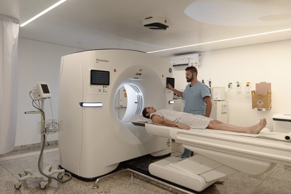 É um exame complexo realizado em um equipamento moderno na radiologia que reproduz imagens de...